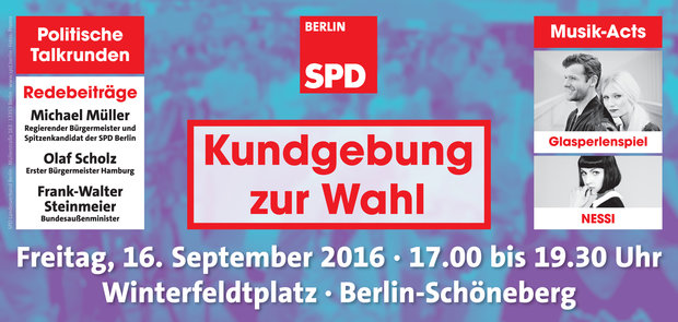Die Berliner SPD lädt am 16. September ab 17 Uhr zu einer Kundgebung auf dem Winterfeldtplatz. Es sprechen Berlins Regierender Bürgermeister Michael Müller, Hamburgs Erster Bürgermeister Olaf Scholz und Bundesaußenminister Frank-Walter Steinmeier.