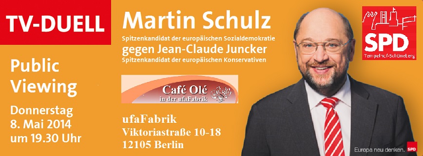 Die SPD Tempelhof-Schöneberg lädt ein zum Public Viewing des TV Duells der europäischen Spitzenkandidaten Martin Schulz und Jean-Claude Juncker