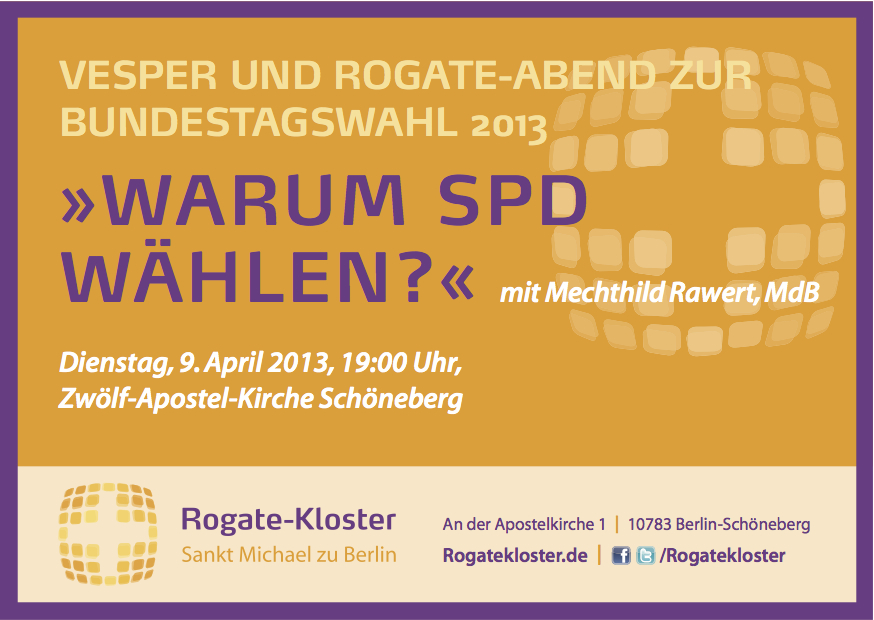 Dienstag, 9. April, 19.00 Uhr, Vesper, anschließend Rogate-Abend "Warum SPD wählen?", mit Mechthild Rawert, MdB. Beginn in der Zwölf-Apostel-Kirche.