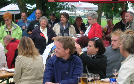 Ein paar Regenschauer dienten der Erfrischung der Genossinnen und Genossen, die das zwanglose Beisammensein gerne auch einmal zu abteilungsübergreifenden Gesprächen nutzten.
