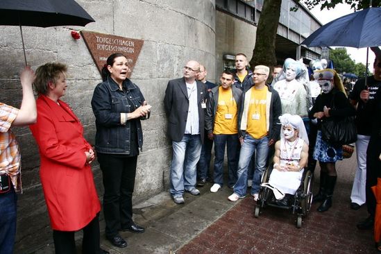 Auf dem Foto sehen Sie Mechthild Rawert, MdB, bei der Kranzniederlegung für die während der Nazizeit getöteten Homosexuellen.