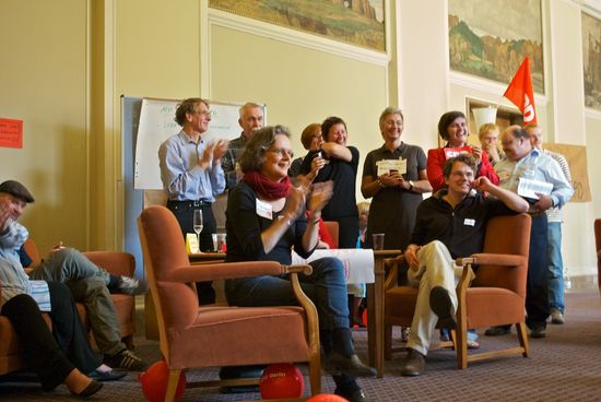 Ein Team von erfahrenen Moderator/innen aus der SPD-nahen Bildungsarbeit hatte diese Versammlung der anderen Art vorbereitet. Es ging ums Ausprobieren für neue Ideen und Wege zu der Politik vor Ort. 60 Genoss/innen hatten sich in der Brandenburghalle des Rathauses Schöneberg eingefunden, um gemeinsam ans Werk zu gehen.