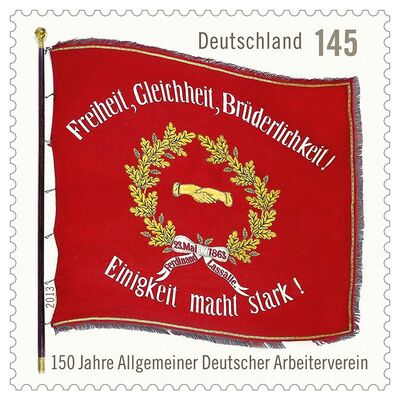 Die Deutsche Post legt zu Ehren des 150. Geburtstages der Sozialdemokratischen Partei Deutschlands eine Sonderbriefmarke im Wert von 1,45 Euro auf. Die quadratische Marke zeigt die rote Traditionsflagge der SPD mit den Worten „Freiheit, Gleichheit, Brüderlichkeit!“ und „Einigkeit macht stark!“.