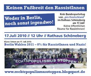 Am kommenden Samstag soll der Bundesparteitag der rassistischen Bewegung „Pro Deutschland“ im Rathaus Schöneberg stattfinden und den Startschuss für den Berliner Ableger „Pro Berlin“ im Hinblick auf die Senatswahlen 2011 geben.